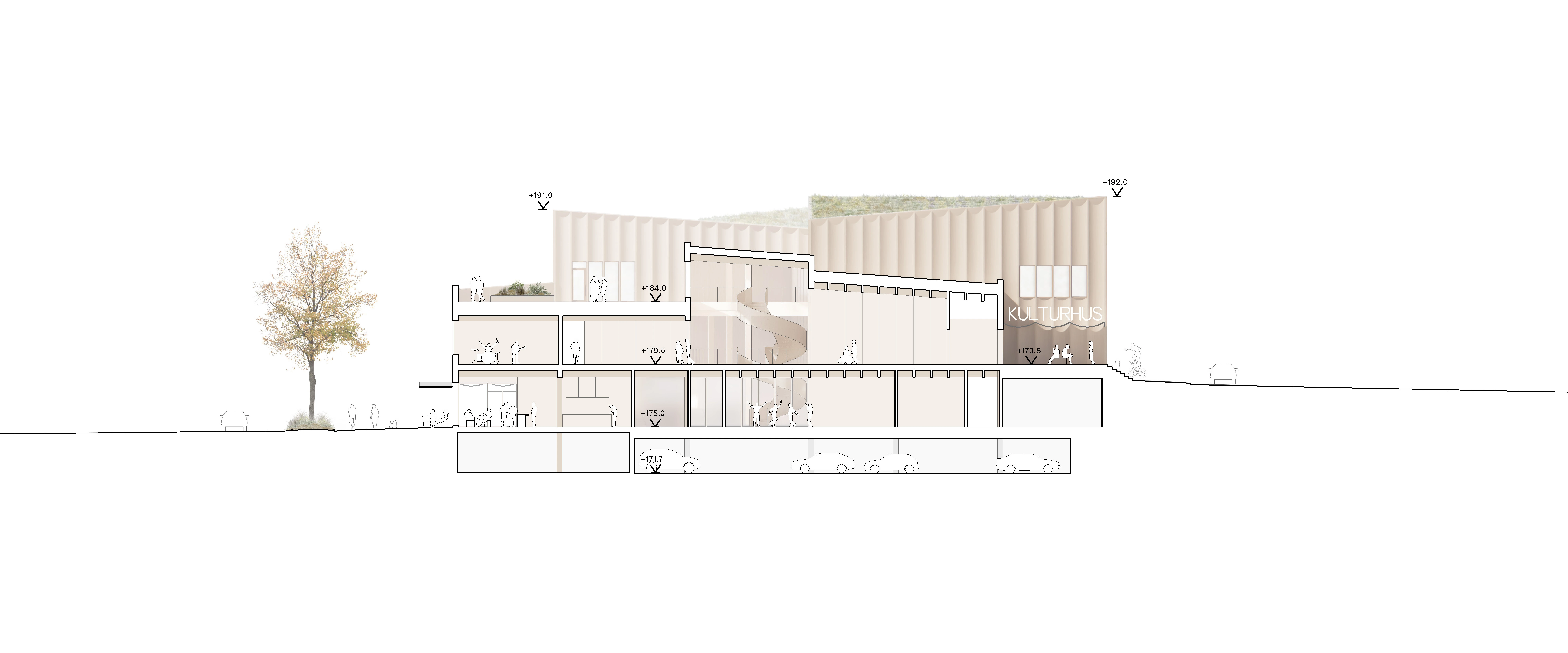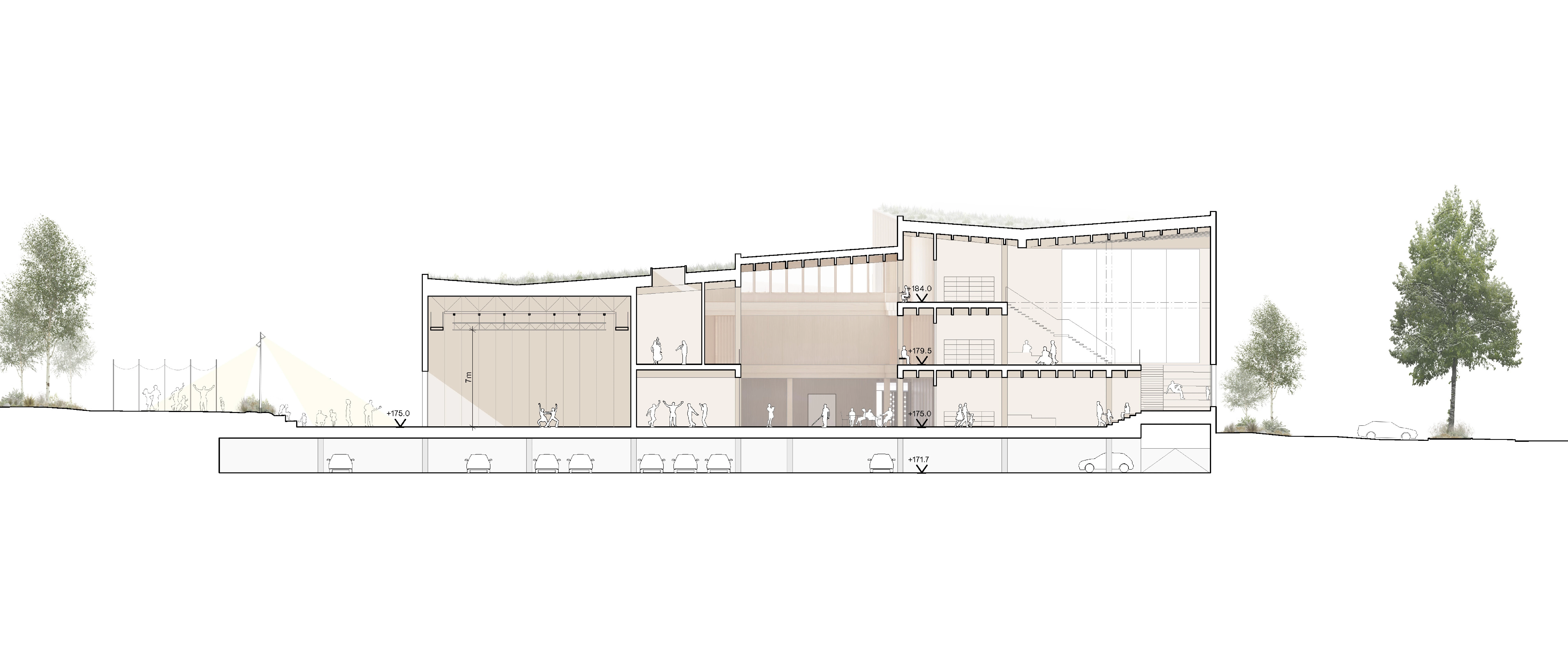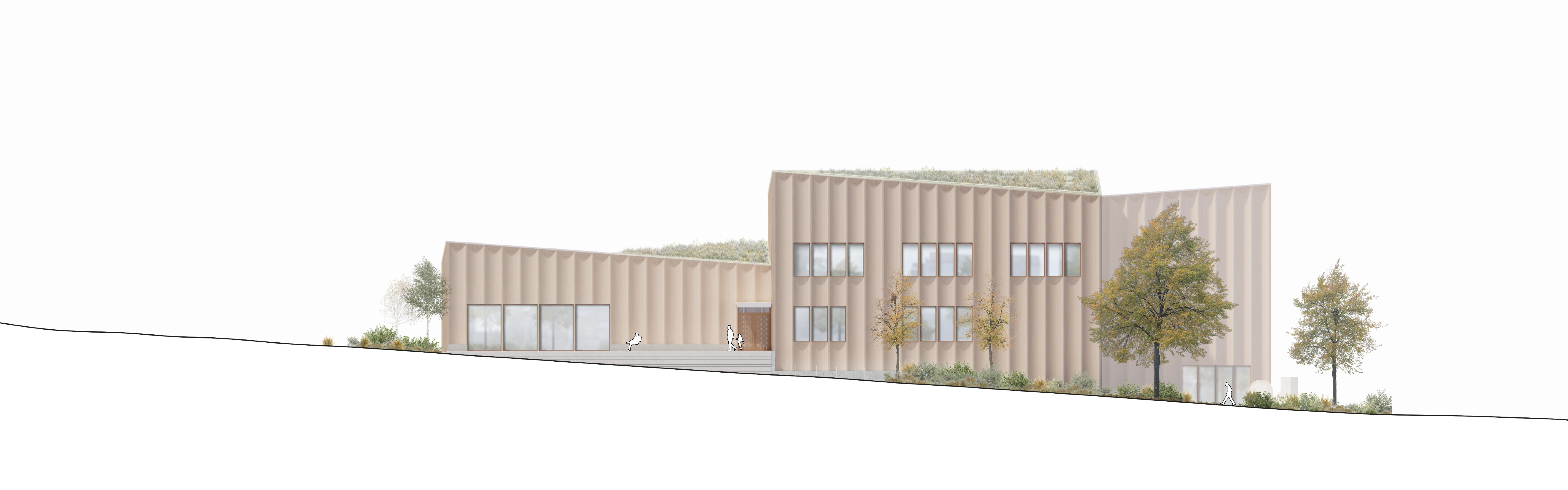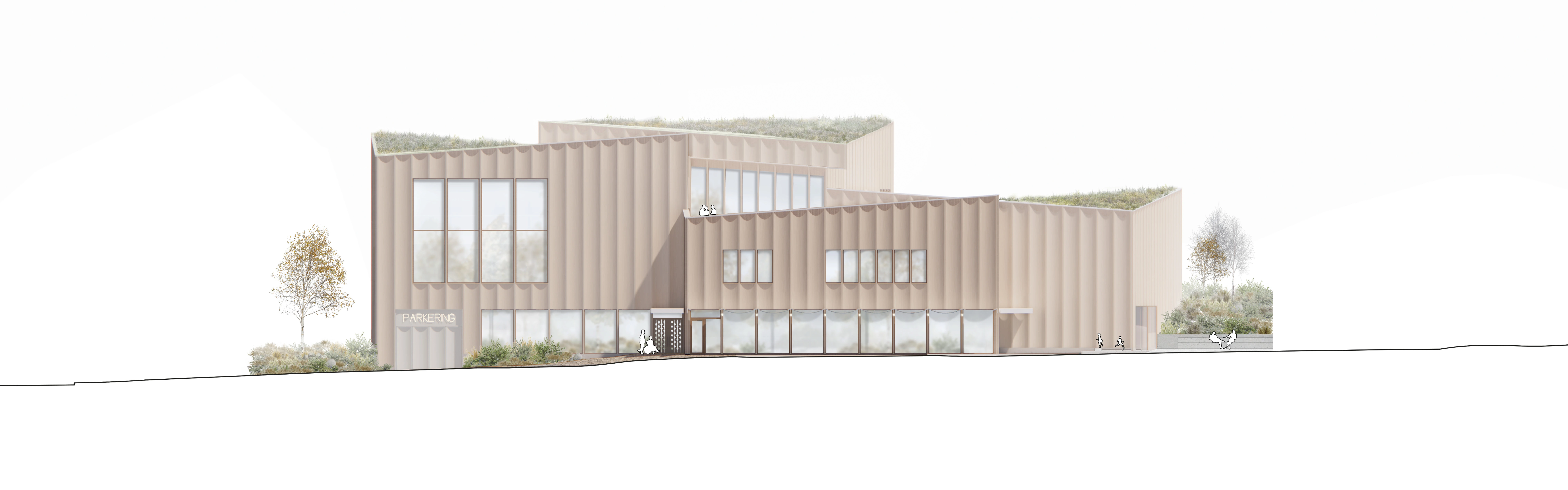 The building is seamlessly woven into the existing urban structure, with entrances on all sides that make it easily accessible from every direction. Each entrance is accompanied by a carefully designed outdoor space inspired by the Ätradalens meadows and grasslands. Extending the city’s granite paving, recycled granite and natural stone create the ground surface, inviting greenery, seating areas, and play to unfold.